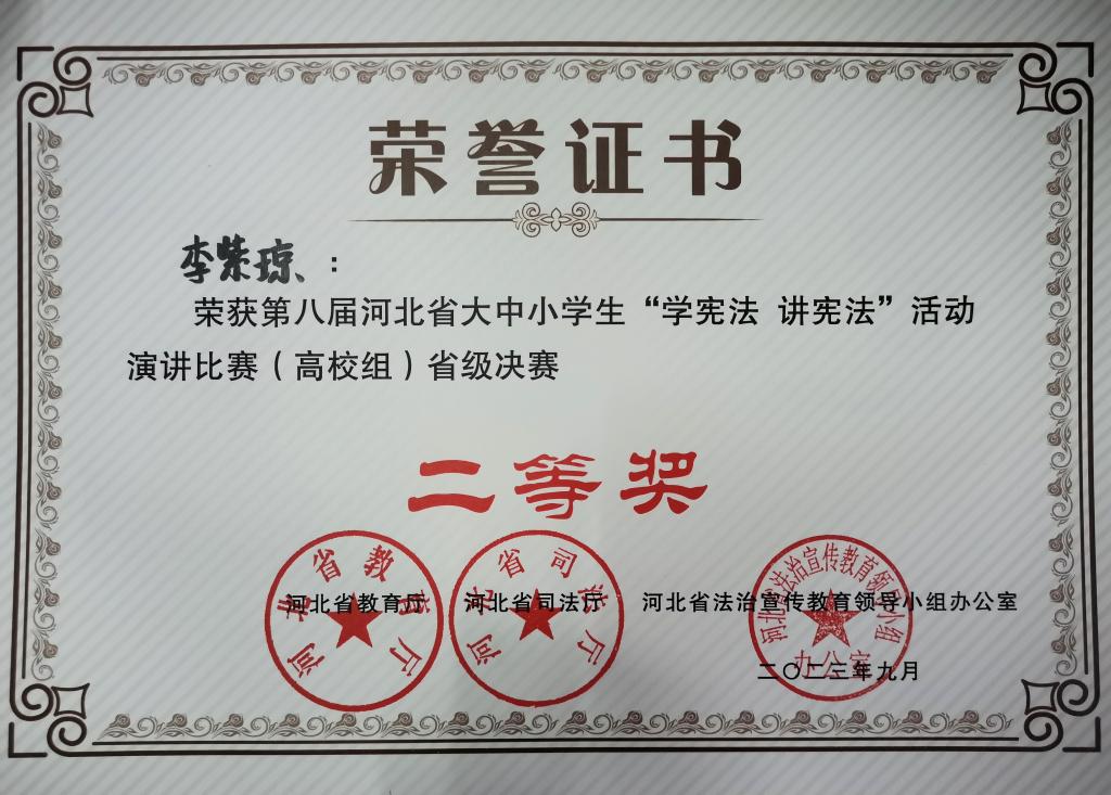 9月26日至27日,由河北省教育厅、河北省司法厅、河北省法治宣传教育领导小组办公室主办的第八届河北省大中小学生“学宪法讲宪法”大赛暨全国选拔赛在河北师范大学举行。beat365选派服装工程系学生李紫琼参加高校组宪法演讲比赛,经过激烈角逐,李紫琼荣获本次大赛(高校组)省级决赛二等奖。