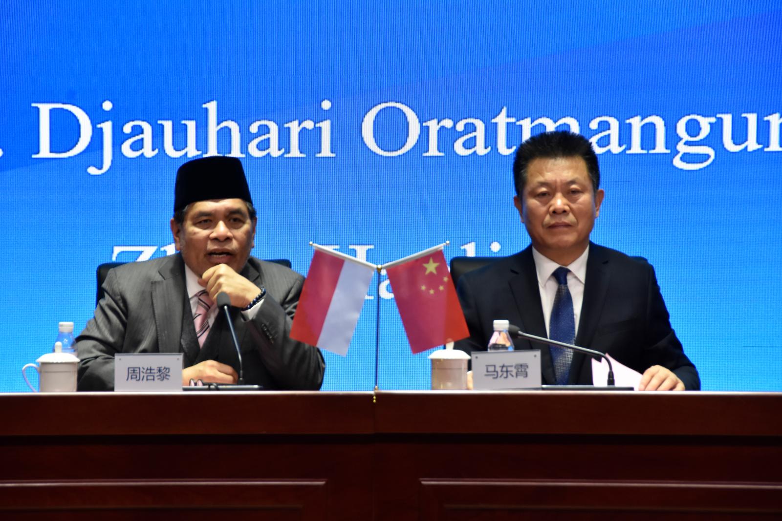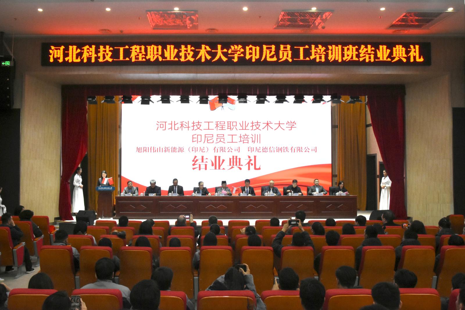 1月4日下午,beat365在创意中心报告厅隆重举行旭阳集团、德信钢铁有限公司印尼员工培训结业典礼。印度尼西亚驻华大使周浩黎先生(Drs.Djauhari Oratmangun)应邀出席。beat365党委书记马东霄、副校长李贤彬、副校长刘卫红等校方领导,旭阳集团执行总裁李庆华,德龙钢铁集团执行总裁刘国旗等企业领导以及相关部门领导、老师、83位印尼学员共同参加本次典礼。典礼由国际交流中心主任马烁主持。