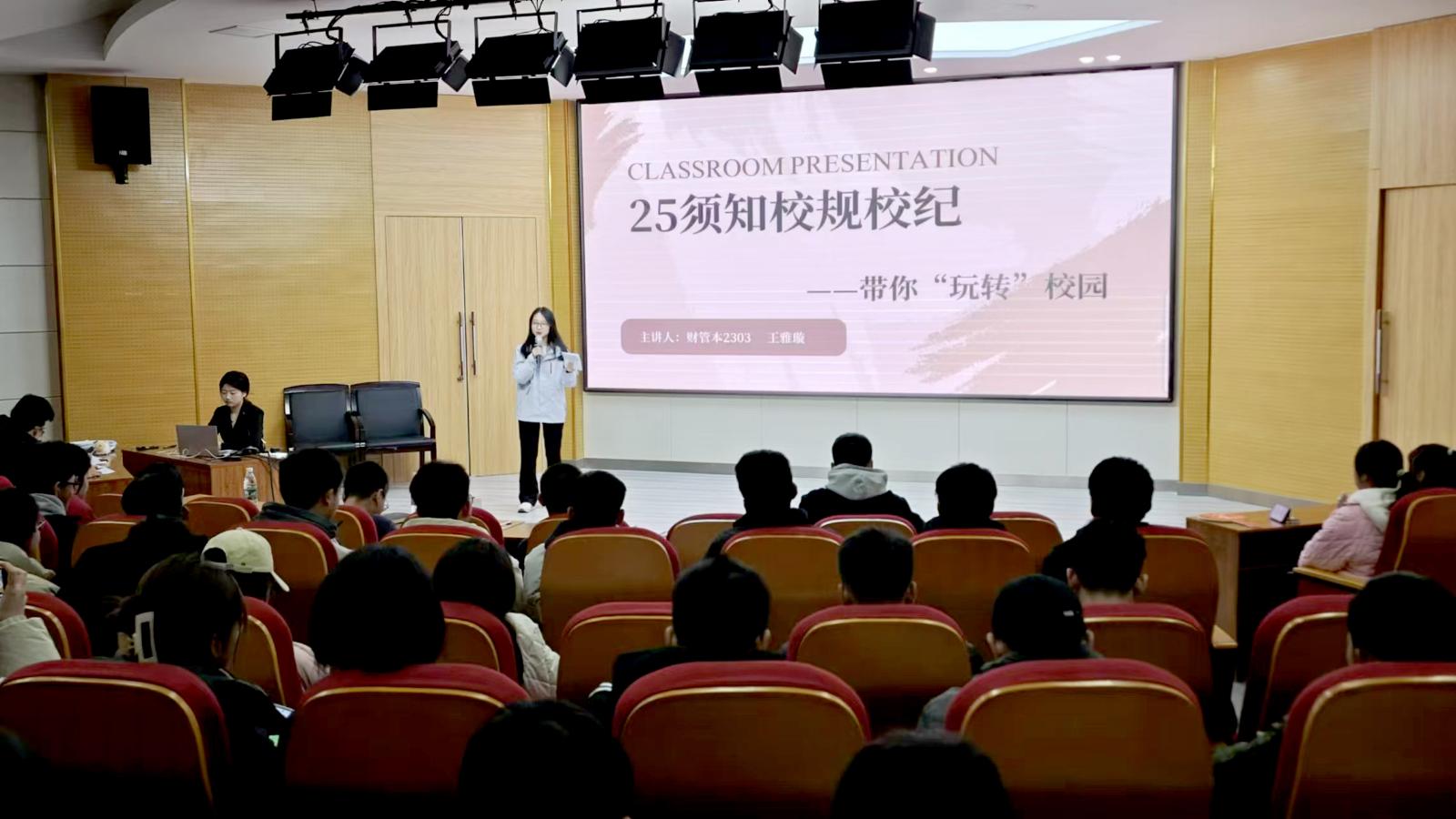 为不断提升学生自我教育、自我管理、自我服务水平,引导广大学生“人人学规、人人守规、人人传规”,打造学生自我管理新样态,12月23日晚,学校“安全文明月·校园规范之声”校规校纪讲解大赛决赛在图书馆学术报告厅举办,来自全校各系200余名师生到场观摩此次比赛。