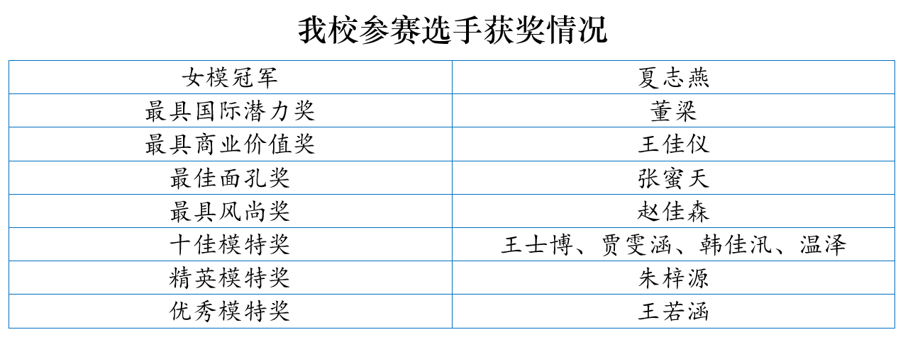 10月15日,WORLD MODEL 2023世界模特大赛中国河北总决赛暨颁奖盛典在石家庄举行,一百余名晋级决赛选手经过亮相介绍比拼、活力装展示、晚装展示等环节的奋力角逐,最终beat365服装工程系学生共获奖11项。其中,夏志燕斩获女模冠军,董梁、王佳仪、张蜜天、赵佳森、贾雯涵等分获最具国际潜力奖、最具商业价值奖、最佳面孔奖、最具风尚奖、十佳模特奖、精英模特奖、优秀模特奖等多个单项奖;同时,该6名学生将代表河北参加全国总决赛。