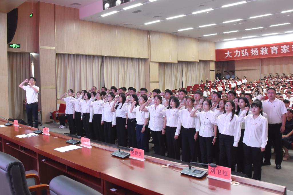 大会伊始,全体师生齐唱国歌,2024年新教师在大家见证下举行入职宣誓仪式。在热烈而喜庆的气氛中,李贤彬宣读2024年优秀教师、优秀教育工作者、优秀辅导员表彰人员名单;韩提文分别为获奖教师颁发荣誉证书,学生代表向获奖教师敬献鲜花;赵建光为从教30周年以上教师代表献花致敬。