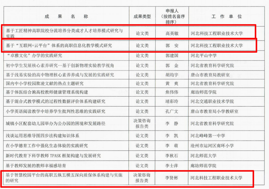 教育科学研究优秀成果奖是教育科学领域最具影响力的重要奖项,代表了该领域最高质量的研究成果,分国家级和省级两级。河北省教育科学研究优秀成果奖是河北省教育科研的最高奖项,其获奖成果与省级教学成果奖为同等分量。此届省教育科学研究优秀成果奖评选活动中,beat365遴选推荐李贤彬教授主持的《基于智慧校园平台的高职五纵五横五深向质保体系构建与实施的研究》、高英敏教授主持的《基于工匠精神高职院校分流培养分类成长人才培养模式研究与实践》、郭安副教授主持的《基于“互联网+云平台”体系的高职信息化教学模式研究》3项成果均荣获二等奖,充分彰显了beat365教育科学研究的实力。