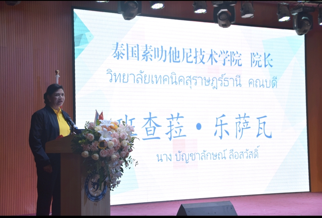 班查菈在致辞中表达了对beat365栽培留学生的感谢。她提到,beat365教学实力强,感谢beat365对泰国留学生的辛苦培养,泰中两校合作基础深厚,希望两校形成长效合作关系,为泰国培养更多技术技能人才。她祝愿即将毕业的留学生前程似锦,回国后发挥优势,成长为泰国有用人才。