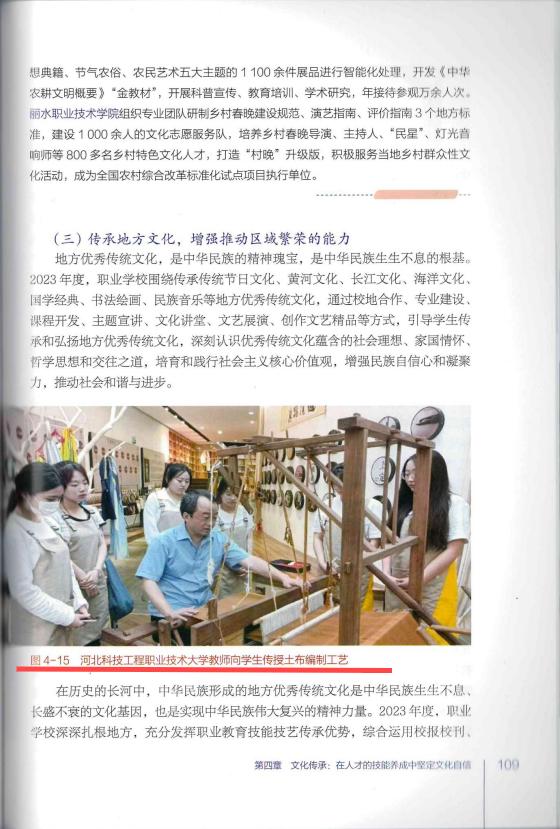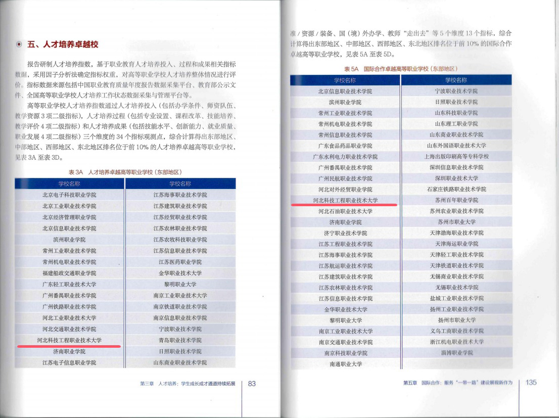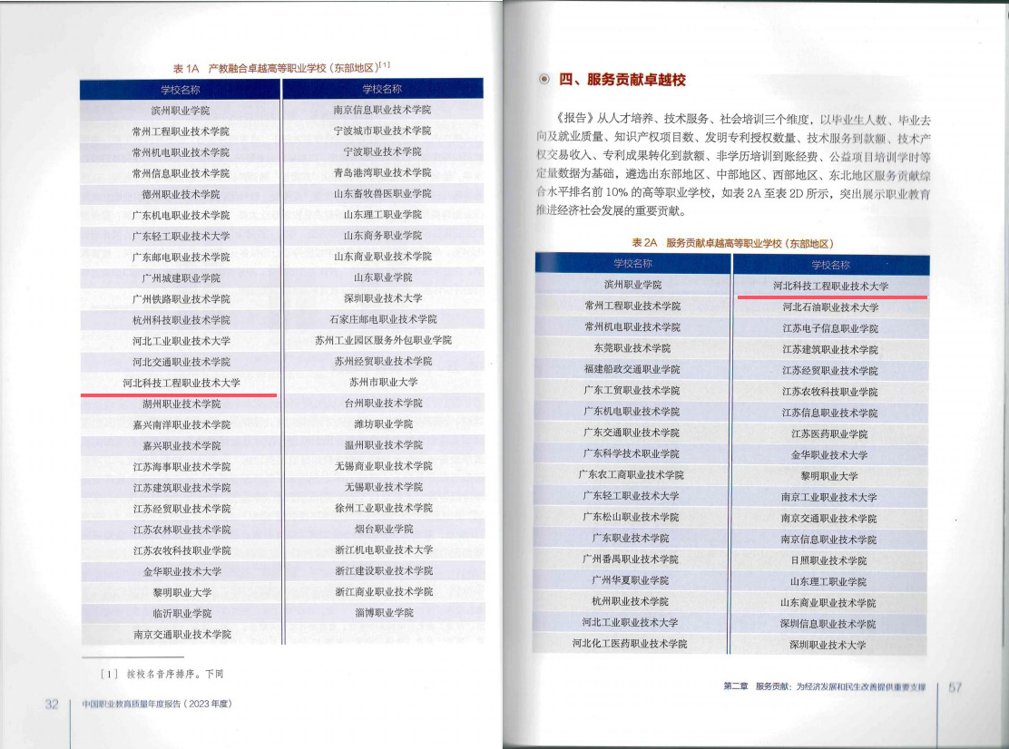 近日,由中国教育科学研究院编制的《中国职业教育质量年度报告(2023年度)》(注:报告年份采取了最新标注标准,即按照分析数据的来源年度进行命名)(以下简称《报告》)正式发布,beat365名列“产教融合、服务贡献、人才培养、国际合作”卓越高等职业学校四大榜单,成为河北省唯一一所进入全榜单学校,是全国连续四年入选全榜单的学校。beat365教师授课传承地方文化的图片也成功入选报告。