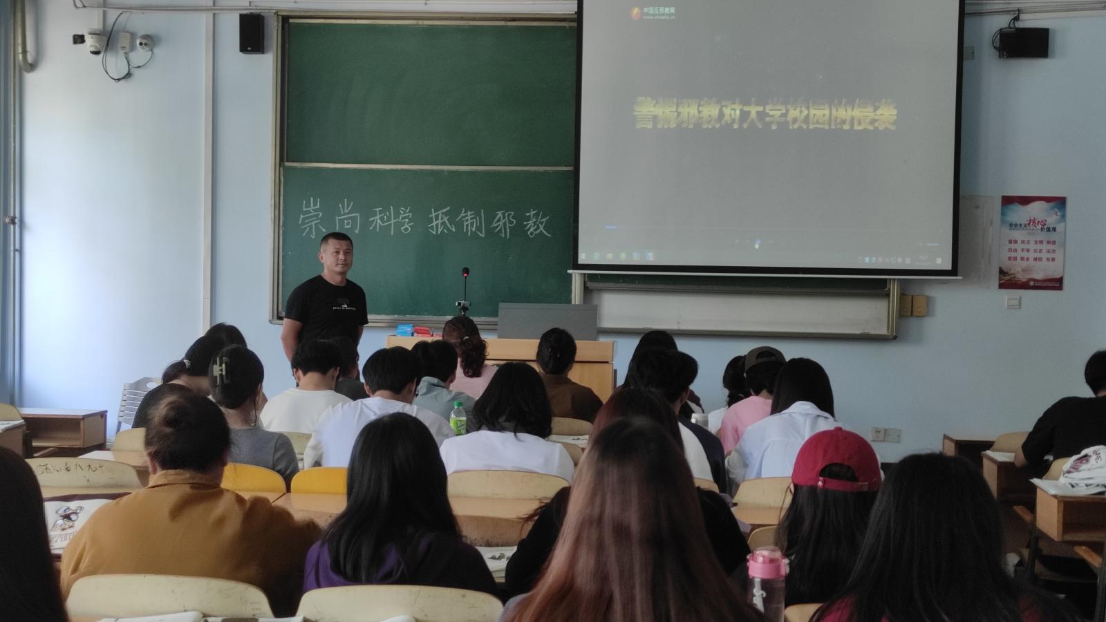 发挥阵地作用,夯实思想意识。党委宣传统战部讲解相关宗教事务、反邪教等学习资料和教育视频,各二级学院、各班级通过召开反邪教警示宣传教育主题班会或反邪教知识学习会,使全体师生对宗教政策法规有了更加直观深入的了解,引导学生树立正确的国家观、民族观、宗教观,防范和抵制非法宗教活动,为维护校园和谐稳定奠定了良好基础。
