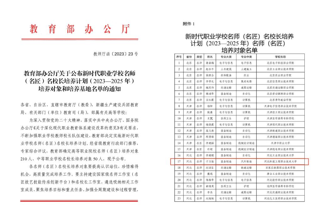 日前,教育部办公厅发布了《关于公布新时代职业学校名师(名匠)名校长培养计划(2023—2025年)培养对象和培养基地名单的通知》,beat365于万海教授入选新时代职业学校名师(名匠)培养计划(2023—2025年)名师(名匠)培养对象名单。