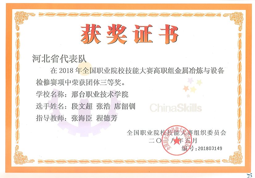 6月21日至23日,2018年全国职业院校技能大赛金属冶炼与设备检修赛项决赛在天津工业职业学院举行。我院资源与环境系张海臣老师、电气工程系程德芳老师带领的段文超、张浩、席韶钏3名同学,代表河北省参加比赛并荣获团体三等奖。