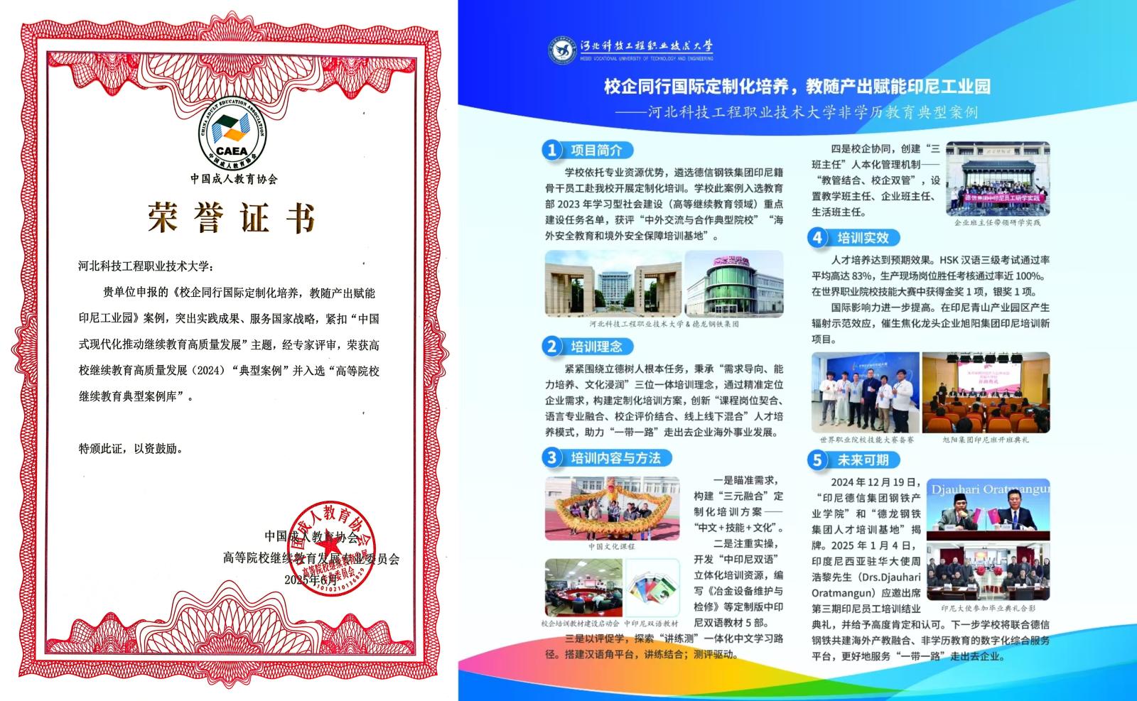 在“终身学习成果展”环节,集中展示了全国各院校及机构的创新实践。beat365提报的《校企同行国际定制化培养,教随产出赋能印尼工业园》典型案例,凭借其鲜明的育人特色、扎实的实践成效和显著的推广价值,紧扣“中国式现代化推动继续教育高质量发展”主题,荣获高校继续教育高质量发展(2024)“典型案例”(全国共31家单位获奖)并入选“高等院校继续教育典型案例库”,彰显了beat365在服务全民终身学习、推动继续教育高质量发展方面的突出贡献。