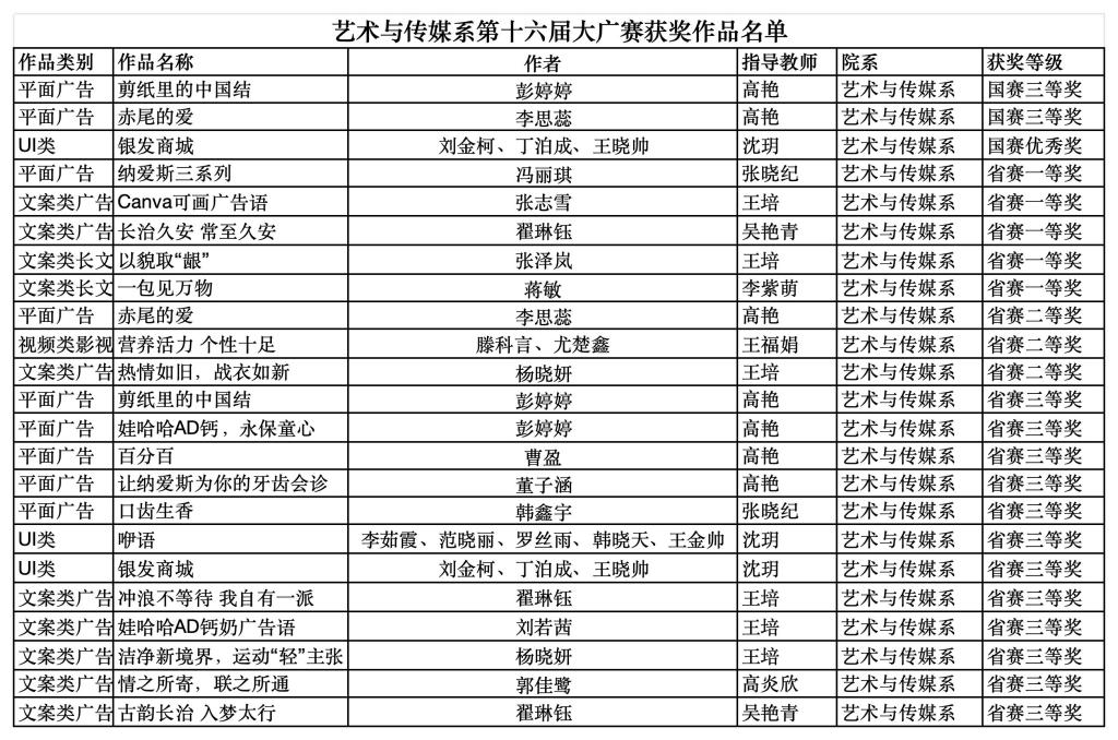 9月6日,由教育主管部门指导、全国大学生广告艺术大赛组委会、中国传媒大学、大广赛文化传播(北京)有限公司共同举办的第十六届全国大学生广告艺术大赛评选结果揭晓。此次大广赛共收到来自全国29个赛区1873所高校报送的755477组参赛作品,参赛师生高达1919775人次。经过层层筛选、角逐,beat365艺术与传媒系学生的作品获得国家级三等奖2项、优秀奖1项;省级一等奖5项、二等奖3项、三等奖12项。