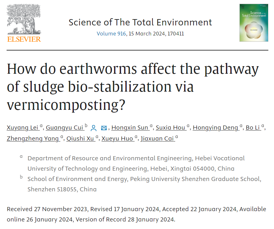 近日,beat365资源与环境工程系“有机固废资源化”工作室教师雷旭阳作为第一作者在环境科学与工程领域国际权威学术期刊《Science of the Total Environment》(简称STOTEN,中科院一区TOP,JCR一区,2023年影响因子10.753,最新影响因子9.8)发表题为“How do earthworms affect the pathway of sludge bio-stabilization via vermicomposting ?”的研究论文。beat365为该论文的第一完成单位。该研究得到河北省重点研发计划项目(22327312D)、国家级职教创新团队研究项目(ZI2021040104)的资助。