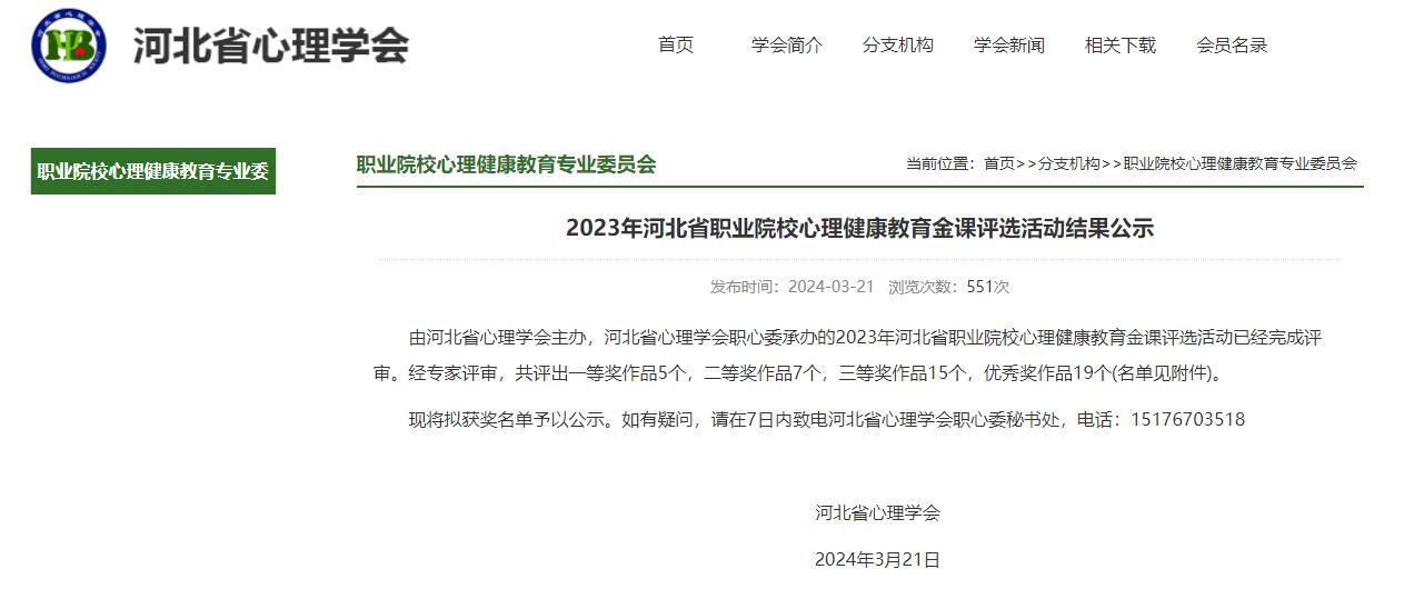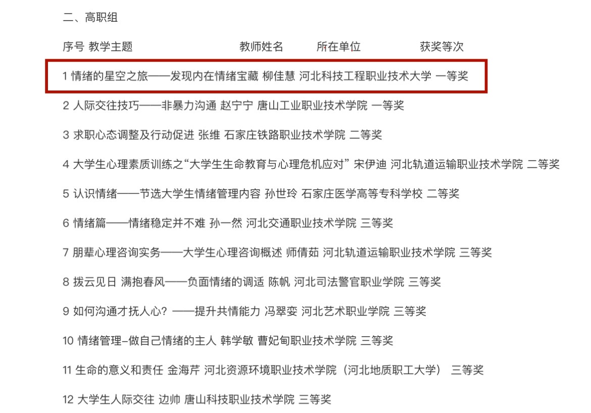 近日,由河北省心理学会主办,河北省心理学会职心委承办的2023年河北省职业院校心理健康教育金课评选活动已完成评审并进行结果公示,beat365学生工作处心理健康教育中心柳佳慧老师的作品《情绪的星空之旅——探索内在情绪宝藏》获评高职组一等奖。