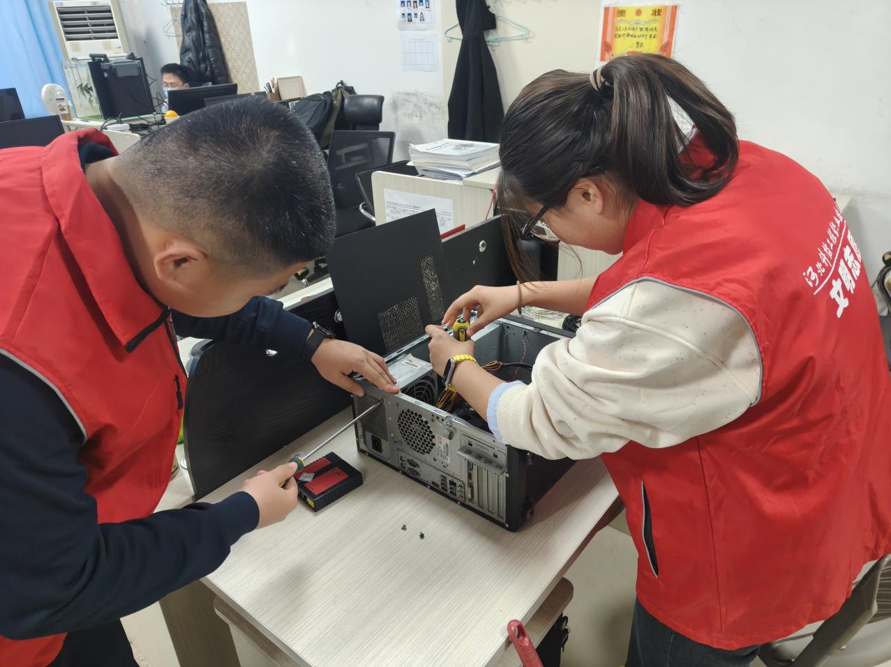 活动前期,我院团总支组织部成员提前调研机房痛点,联合实训中心开展安全培训,明确防静电操作规范、设备清洁禁忌等核心要点,并备齐防静电抹布、线路整理扣、专用清洁剂等专业工具。活动中,志愿者们分为设备清洁组、线路规整组、环境消杀三个组:清洁组擦拭机柜顶部与显示屏,清理主机散热口灰尘;线路组梳理缠绕的数据线、电源线,用整理扣逐一固定,给每条线路贴上标识标签;消杀组则按照“一喷二擦三通风”流程,对操作台面、地面进行全方位消毒,不留卫生死角。大家分工协作、相互配合,使机房焕然一新。