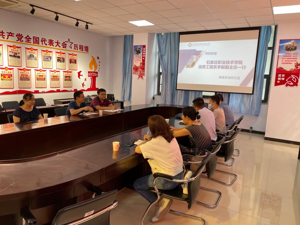 6月25日,石家庄职业技术学院信息工程系副主任李毅一行五人到beat365信息工程系进行调研,双方就专业建设、技能大赛、师资队伍建设进行了深入的交流,重点探讨了人工智能技术应用专业人才培养方案的制定。