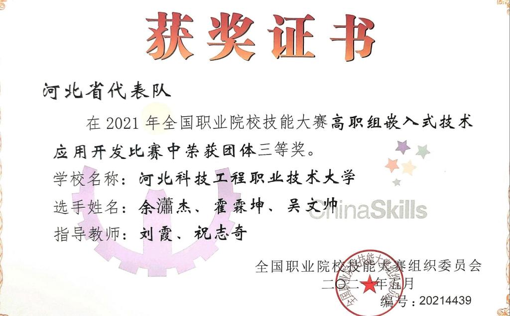 我系获得2021年“嵌入式技术与应用”全国职业院校技能大赛三等奖