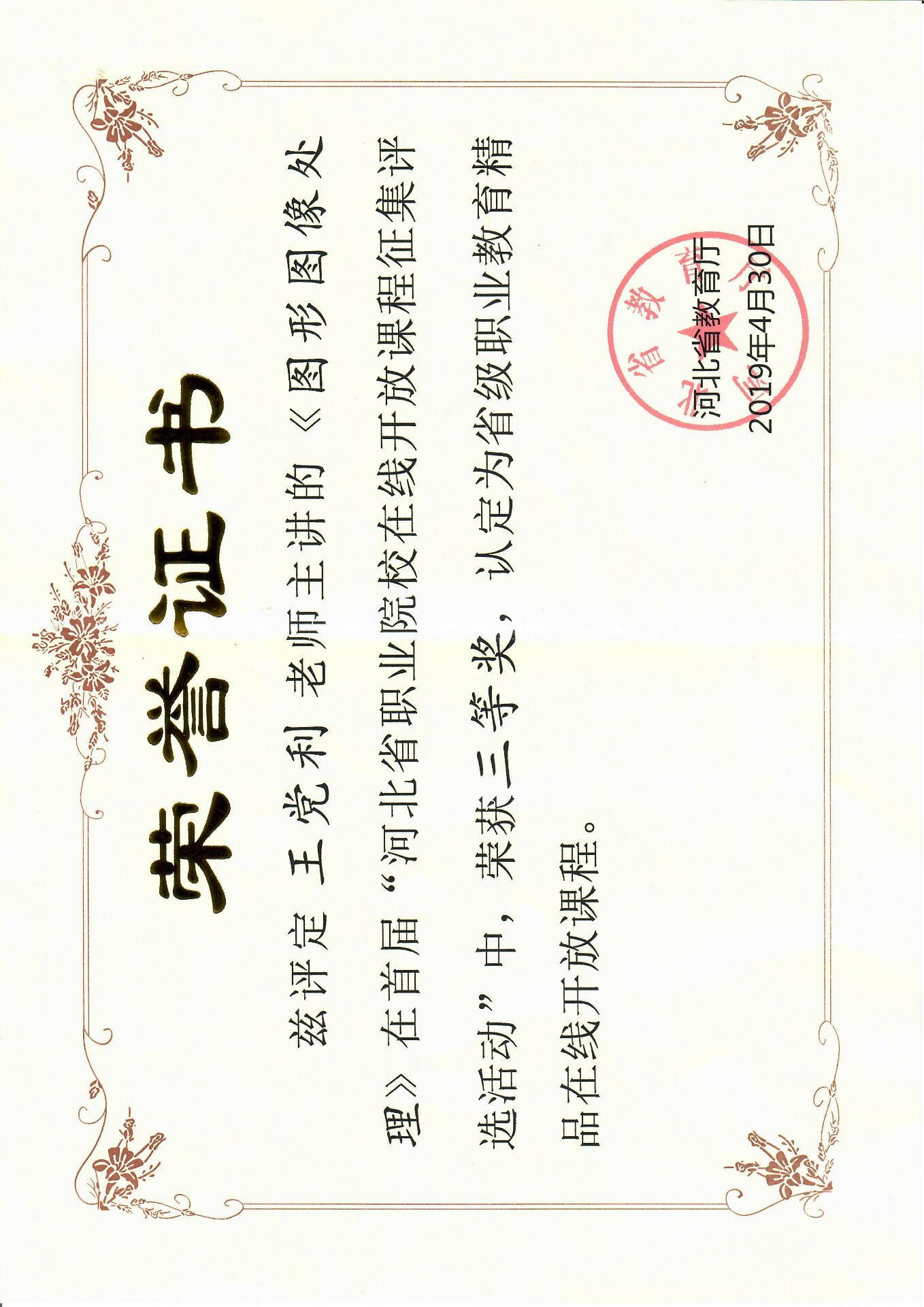 图形图像处理这门课程旨在培养学生利用计算机进行图像处理的能力。包括摄影作品、视频编辑、网页设计、多媒体课件界面设计以及有关教育资源开发中遇到的图像处理等问题。从2015年开始微课建设立项以来,遵循边建设,边应用的原则,截止2017年课程建设完成上线,已经经过两届学生的测试学习,取得了显著的成效。在整个应用的过程中,学生访问平台并不只是应付检查式的刷课,而是通过视频的学习,真正掌握这些知识点,并通过案例式教学方式,实现操作,掌握该技能。该翻转课堂教学模式的应用,将学生学习从一个被动接受知识的过程向应用知识、探索知识和创造知识的过程转变。该课程在2019年首届“河北省职业院校在线开放课程征集评选活动中”,被评为河北省精品在线课程。