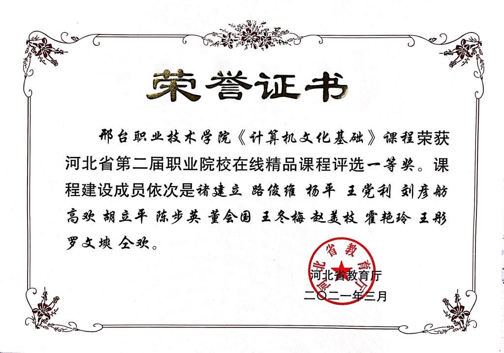 《计算机文化基础》课程属于电子信息大类,是在校大学生的一门通识必修课。通过本课程的学习,培养学员了解计算机系统的组成和计算机网络构成的基本知识,掌握常用办公软件Word、Excel、PowerPoint的使用方法,提高学员对计算机及网络的操作应用能力,使学员为后续专业课程的学习、职业生涯发展及后期走上工作岗位奠定知识和能力基础。二十多年来经过多轮课程改革,一直是学院重点建设课程之一。2002年,《计算机文化基础》被评为河北省高等学校首批省级优秀课程。2007年,河北省对2002年被评为省级优质课程进行评估,《计算机文化基础》被评为良好。2020年,《计算机文化基础》被评为河北省省级精品在线课程。