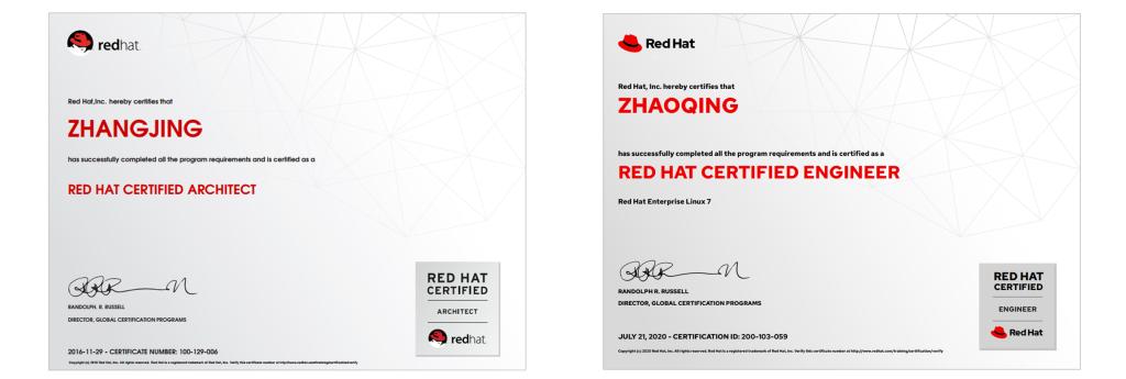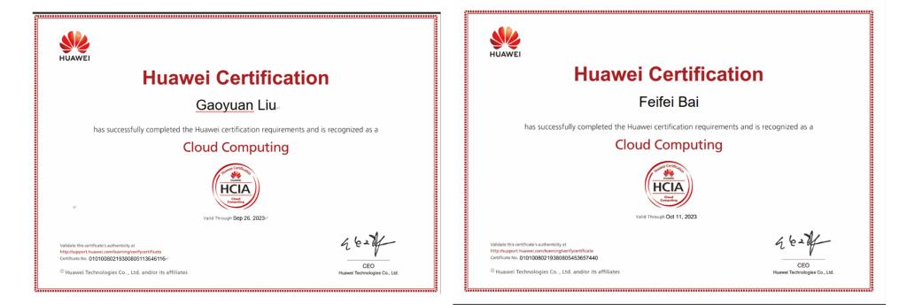 现已取得华为云计算HCIA证书人数达100余人,取得腾讯云服务操作中级证书50余人,取得红帽顶级RHCA证书2人,中级RHCE证书5人,初级RHCSA证书10余人,取得阿里云ASA证书1人。
