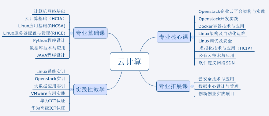 本专业主要培养具有云计算技术应用与Linux开发运维能力,掌握云平台搭建、开发、维护基本技能,具有较高综合素质与良好职业素养,可胜任云计算系统规划设计、云计算系统部署与运维、云平台搭建、云应用开发与服务等相关基础工作的复合型高素质技术技能人才。