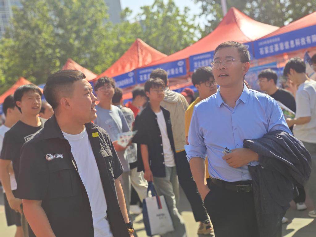 双选会现场人潮如流,气氛热烈。系党总支徐建平书记、冯磊主任深入双选会现场,与用人单位代表交流,详细了解招聘单位的专业需求、岗位需求、薪资待遇等情况,并听取用人单位对我系人才培养的建议。徐书记与冯主任与现场应聘的我系毕业生面对面沟通求职意向和就业进展情况,勉励大家砥砺奋进、学以致用,争做担当民族复兴大任的时代新人,并积极向用人单位推介我系毕业生。