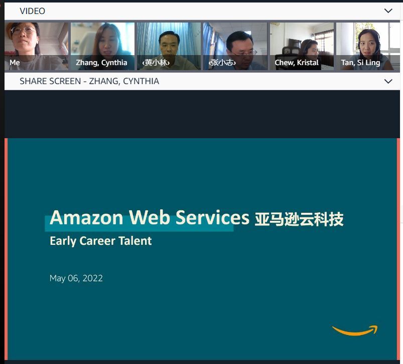 5月6日下午,信息工程系与亚马逊云科技线上交流会如约进行。亚马逊云科技东南亚区域校招总经理Kristal、中国区校招负责人谭思玲、招聘主管张璇,信息系党总支书记黄小林、副主任张小志、大数据教研室主任李洪燕、系就业指导办李慧琼、张静老师参加会议。