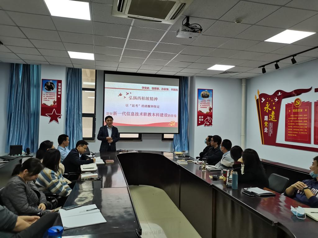 王海宾主任从“西柏坡精神形成的历史条件”“西柏坡精神的内涵”“弘扬西柏坡精神,做好职教本科建设”三个方面讲解了西柏坡精神,并结合国家开展本科职教的重要意义,重点阐释了西柏坡精神的现实意义。王主任带领大家集中观看了毛泽东在第一届全国政协会议开幕式上讲话的珍贵视频,重温共产党“进京赶考”的历史记忆,并强调,1921年至2021年是建党一百年,1991年至2021年是学校探索高职教育三十年,我们要将学校职教本科建设看作新时期的“进京赶考”,努力弘扬新时代西柏坡精神,做到戒骄戒躁,脚踏实地,勇于探索,艰苦奋斗。最后,王主任表示,希望全系师生将学党史、悟思想、办实事、开新局落到实处,奋发努力,砥砺前行,以“赶考”的清醒和坚定,答好新一代信息技术职教本科建设的答卷。
