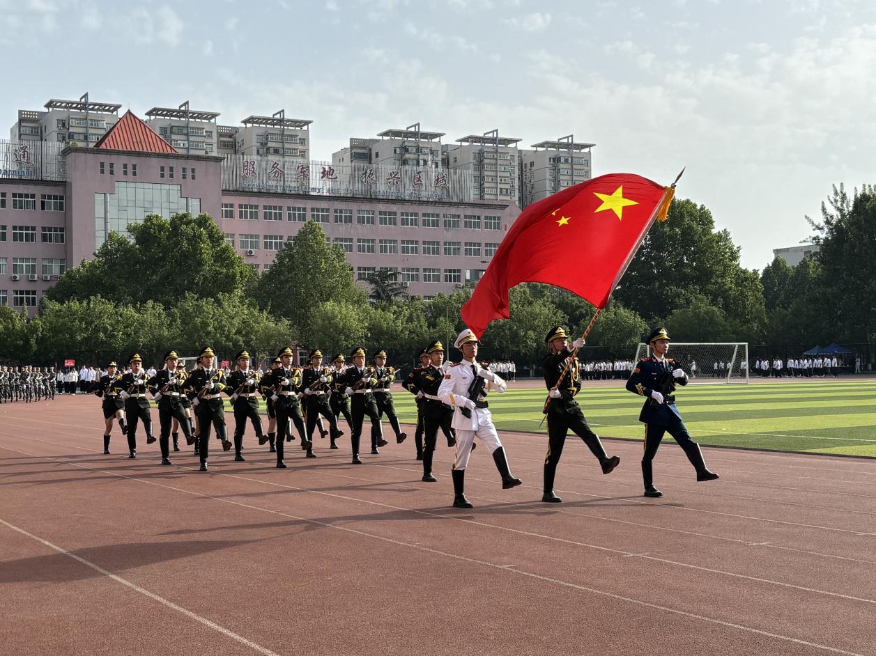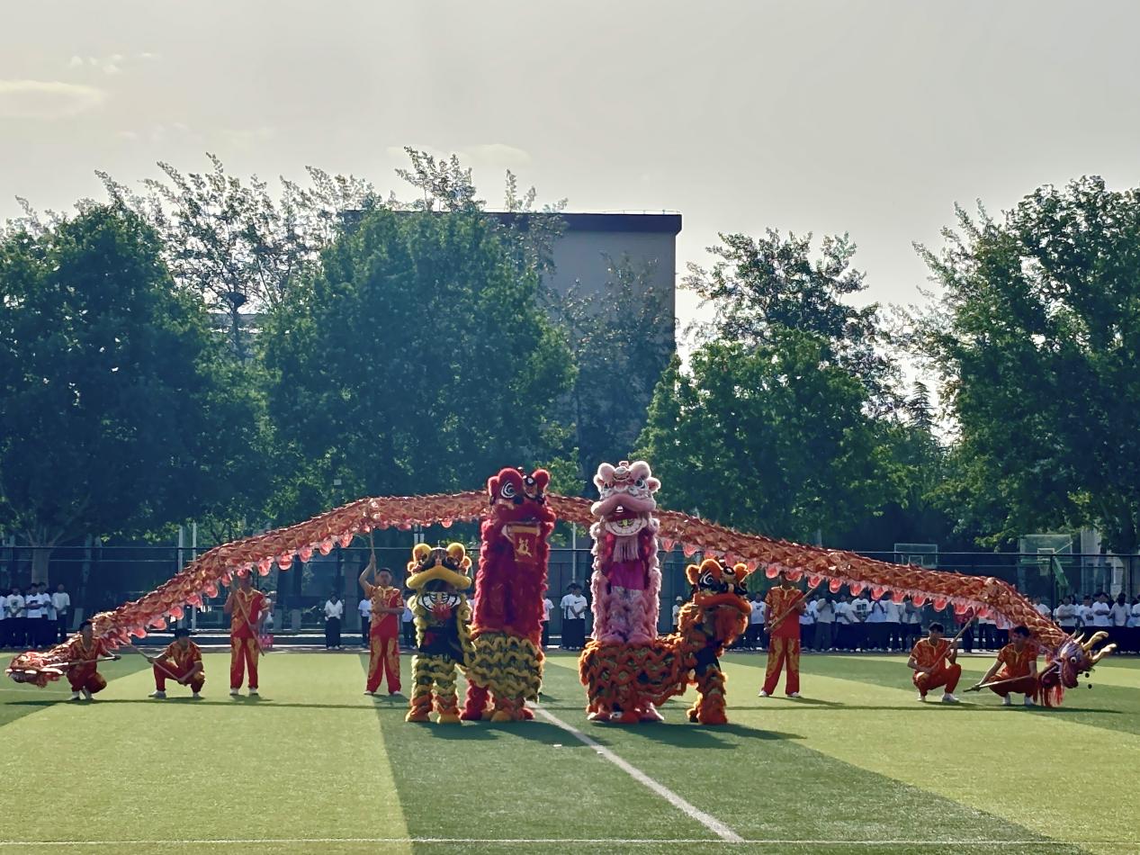由学生带来的中华民族优秀传统体育项目舞龙舞狮、热情洋溢活力四射的啦啦操表演首先登场,热场过后,在激昂的乐曲声中,国旗护卫、裁判员、教官队、各方队依次入场,赛场内,旗帜飘扬,方阵整齐,在雄壮的国歌声中,庄严肃立,尽显昂扬风貌。