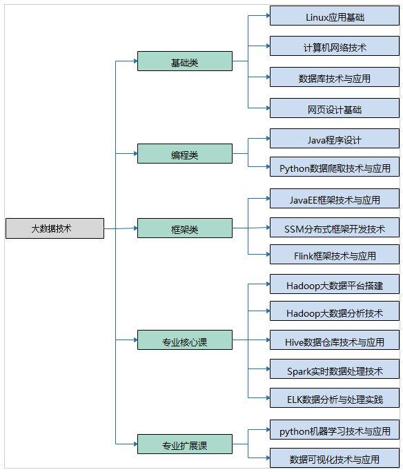 主干课程:Java程序设计、大数据平台运维1+x、Python程序设计、数据采集技术与应用、Spark数据处理技术与应用、机器学习技术、Hive数据仓库技术与应用、数据库技术与应用、Flink框架技术与应用和机器学习等。