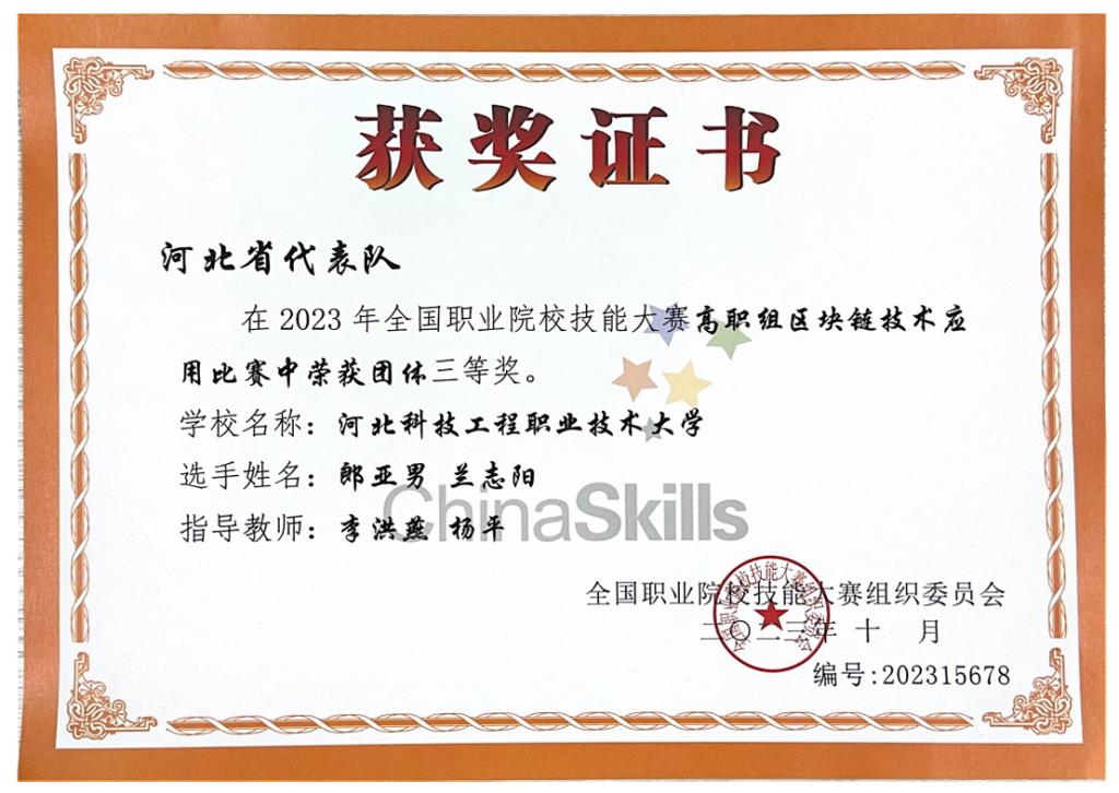 图10:2023年全国职业院校技能大赛区块链技术应用全国三等奖
