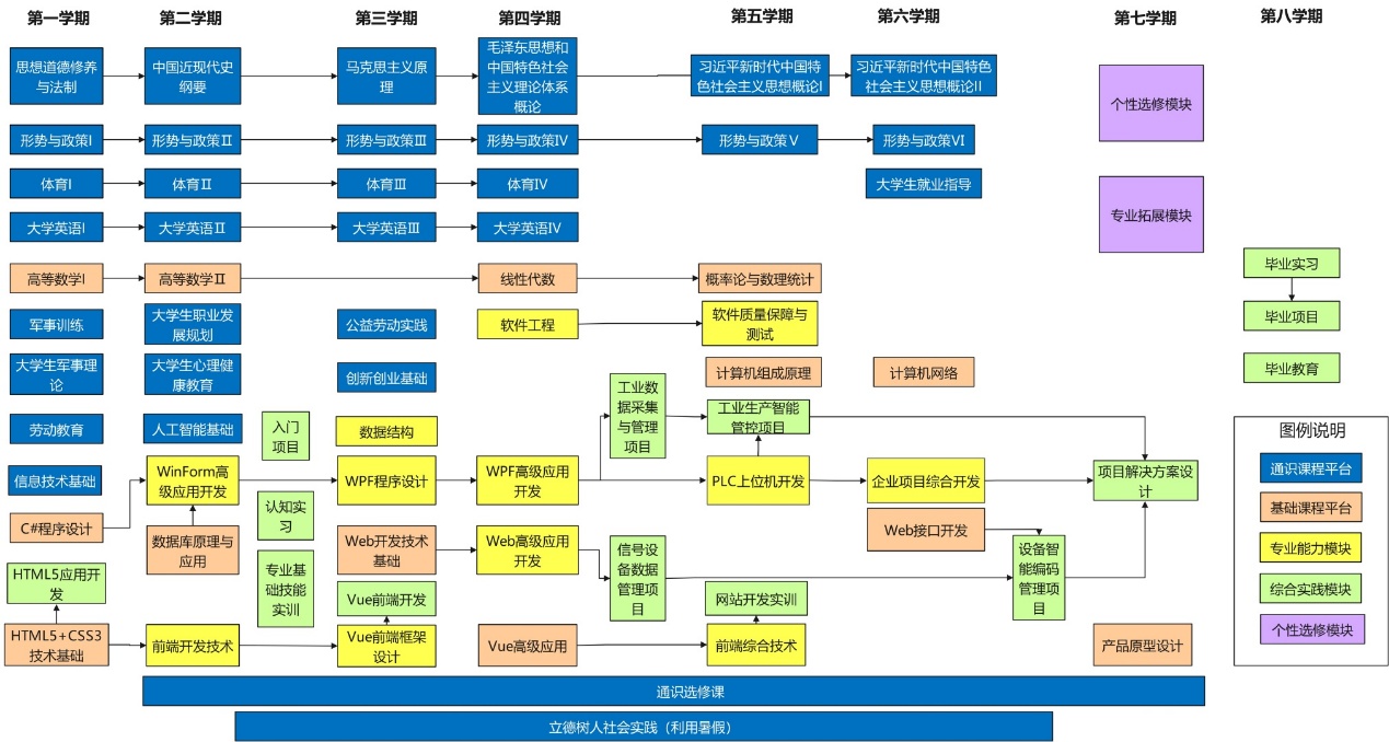 C#程序设计、HTML5+CSS3技术基础、WinForm高级应用开发、Web开发技术基础、WPF程序设计、软件工程、软件质量保障与测试、Web高级应用开发、Web接口开发、WPF高级应用开发、PLC上位机开发、Vue前端框架设计、前端开发技术、Vue高级应用。