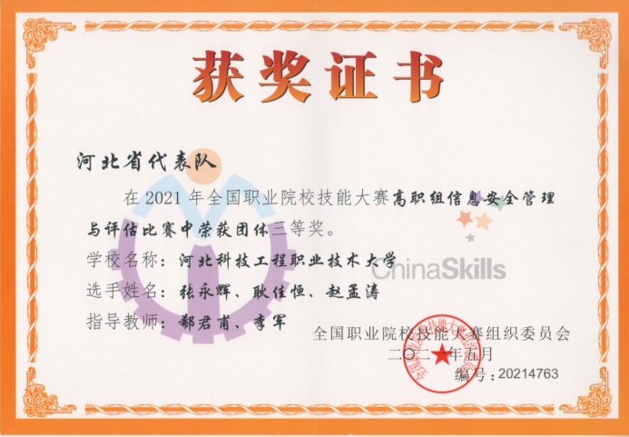 自参与河北省职业院校技能大赛以来,工作室成绩斐然。在信息安全管理与评估赛项中,斩获省赛个人一等奖 6 项、团体一等奖 3 项、二等奖 4 项、三等奖 3 项;在国赛中,荣获一等奖 1 项、二等奖 2 项、三等奖 1 项;在世界职业院校技能大赛争夺赛中,勇夺银奖。这些优异成绩充分彰显了专业在人才培养方面的卓越成效,也为学生未来的职业发展奠定了坚实基础。