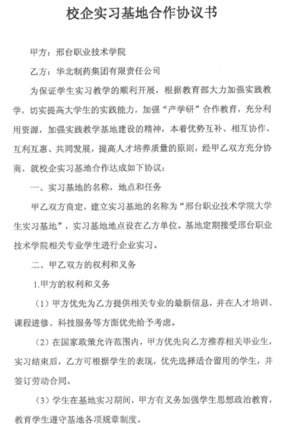 建立了28个基础较好、规模较大的校外实训基地:河北旭阳焦化有限公司实训基地、华北制药股份有限公司实训基地、河北润峰环境检测服务有限公司实训基地、北京京畿分析测试中心有限公司实训基地、旭阳化工有限公司实训基地、邢台市环境保护技术开发中心实训基地、河北绿晨环境检测技术服务有限公司实训基地、河北田加力生物科技股份有限公司实训基地、根力多生物科技股份有限公司实训基地等。现代学徒制对学生的实践能力要求比较高,校外实训基地能够为学生了解并理解企业经营流程提供真实的现场环境,通过对现场系统的操练和观察可以增强学生的学习兴趣,培养学生的应用能力,为更好的实践教学提供了基础。