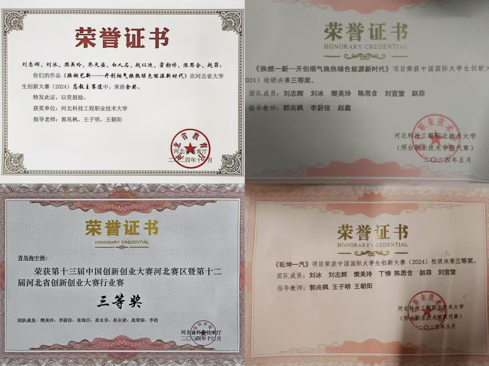 获奖情况:2024年5月《乾坤一汽》项目荣获中国国际大学生创新大赛校级决赛三等奖、2024年12月第十三届中国创新创业大赛河北赛区暨第十二届河北省创新创业大赛行业赛三等奖、2024年5月《换燃一新—开创烟气换热绿色能源新时代》项目荣获中国国际大学生创新大赛校级决赛三等奖、2024年11月《换燃一新—开创烟气换热绿色能源新时代》在河北省大学生创新大赛高教主赛道获金奖