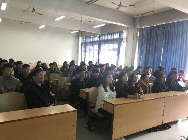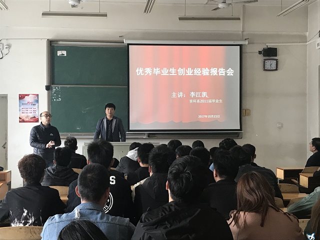 2017年10月24日下午,资源与环境工程系师生在主教506召开创业经验交流会,邢台江清宇环保科技有限公司总经理李江凯,系书记谷群广、主任赵建国,辅导员武立博、柳佳慧以及全体大三学生参加本次大会。